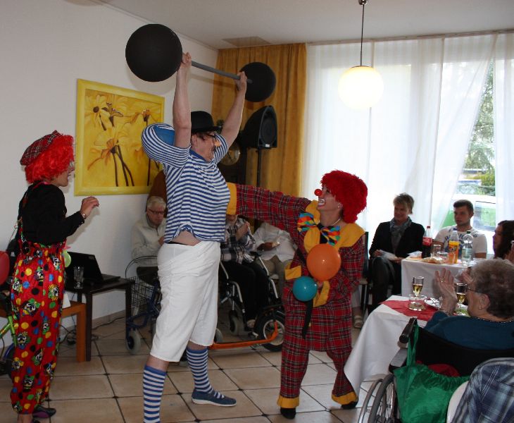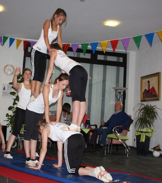Bewohner und Angehörige waren begeistert von den Turnkünsten der jungen Mädchen, die mit einer Akrobatik-Nummer für Staunen sorgten. Der Zauberer faszinierte die Zuschauer mit seinen Tricks. Zum Beispiel verschwand ein Fünf-Euroschein und tauchte später in einer Apfelsine wieder auf. Nach der anschließenden Klamauk- und Clownnummer, vorgeführt von Mitarbeitern des Pflegeteams, waren sich die Bewohner und Angehörigen einig, dass sie dieses schöne Fest lange in Erinnerung behalten werden.